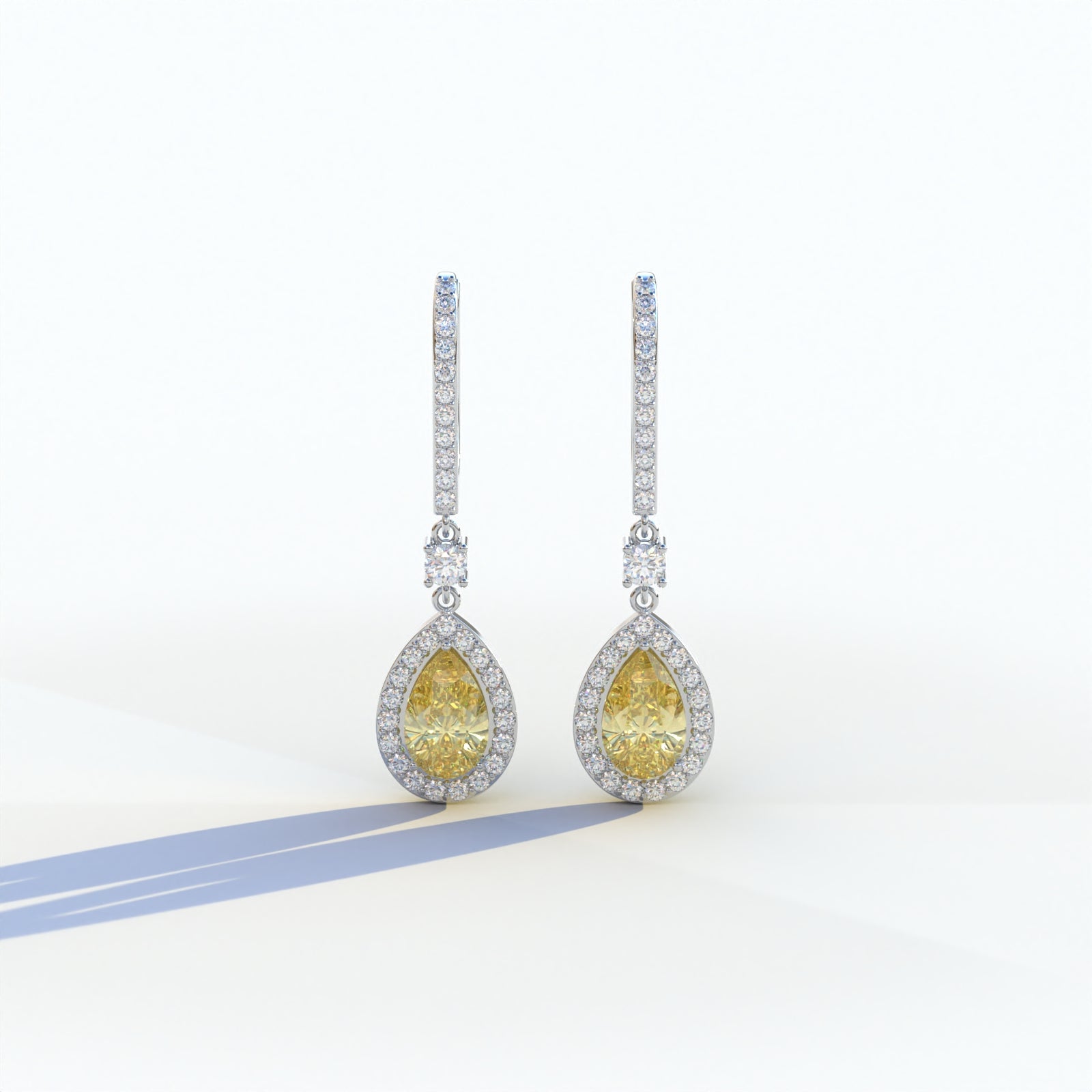 Cleopatra - Pear Cut Yellow Color Diamond Stud Earrings | Halo & Pave Setting | Certified